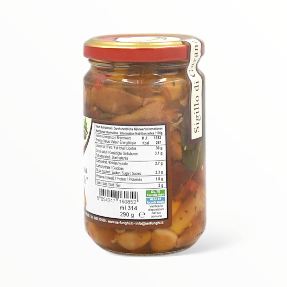 Artisanal preserves made from porcini mushrooms harvested in the Calabrian greenhouses. Flavorful and slightly spicy, they're ideal for appetizers, side dishes, sandwiches, sauces, and main courses. Made without artificial preservatives, they offer an authentic flavor reminiscent of the scents of the forest.